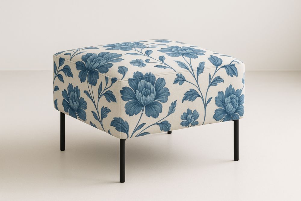 Poggiapiedi in tessuto floreale cotone beige e blu con gambe in metallo nero